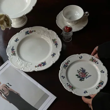 French Vintage Heavy Craft Rose Relief Ceramic Western Porcelain Plate Coffee Cup Saucer Set Modern Dessert Dish