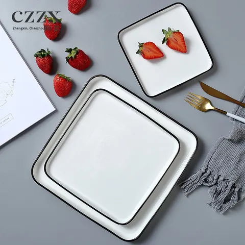 จานอาหารค่ำเซรามิกสีทึบสไตล์นอร์ดิกที่ทันสมัยมีดีไซน์สี่เหลี่ยมขอบดำแบบใช้แล้วทิ้งสำหรับใส่ในทุกวันสำหรับโรงแรม